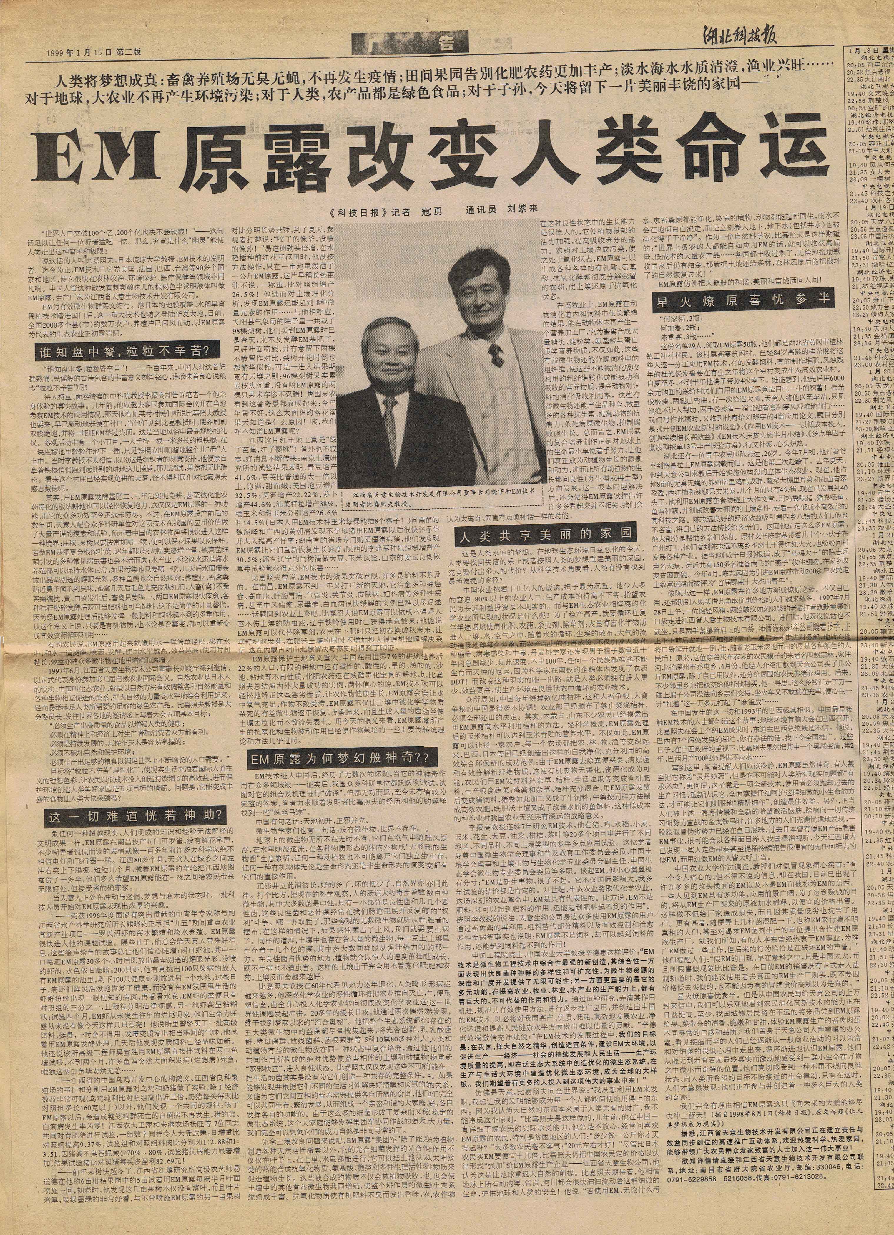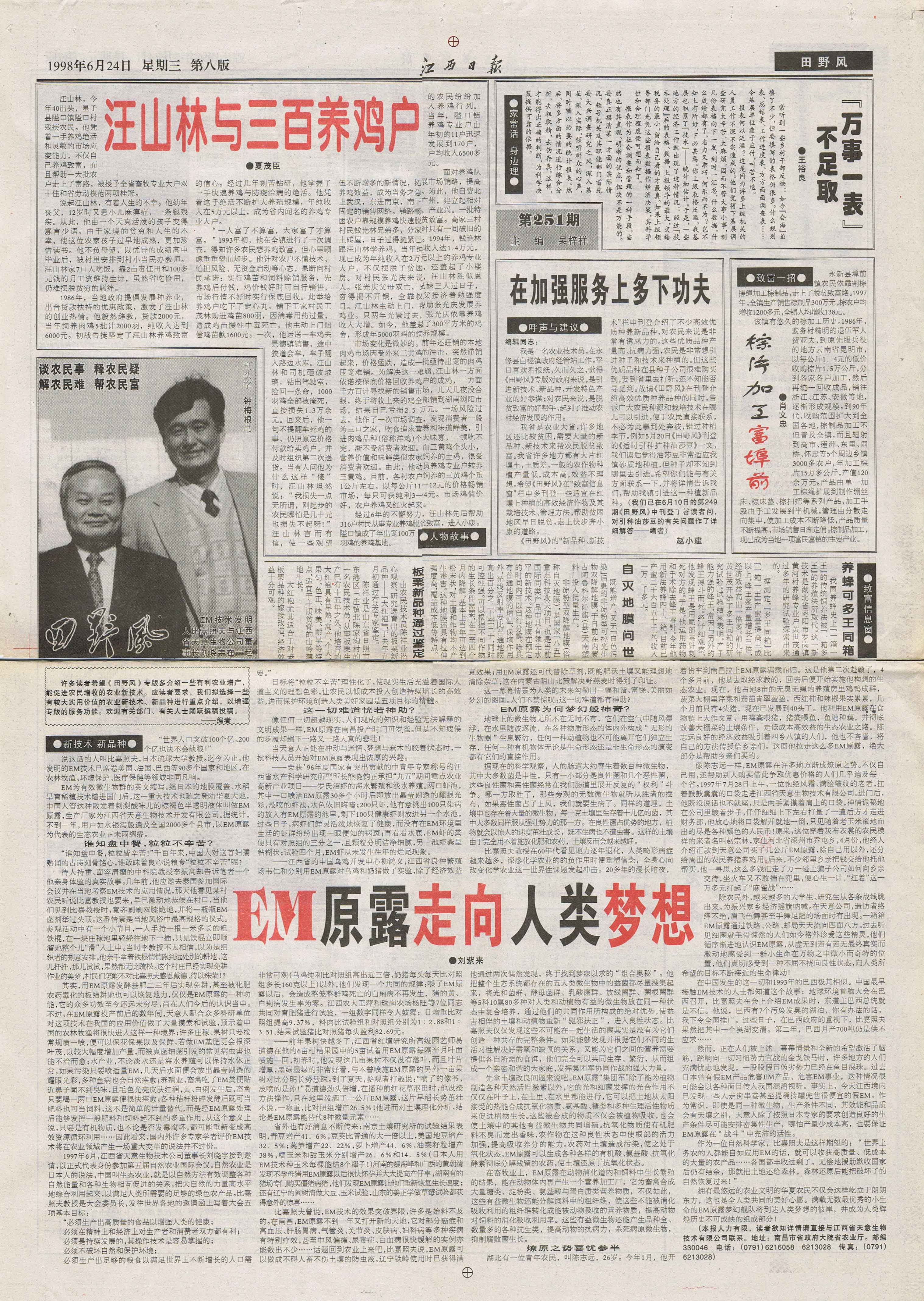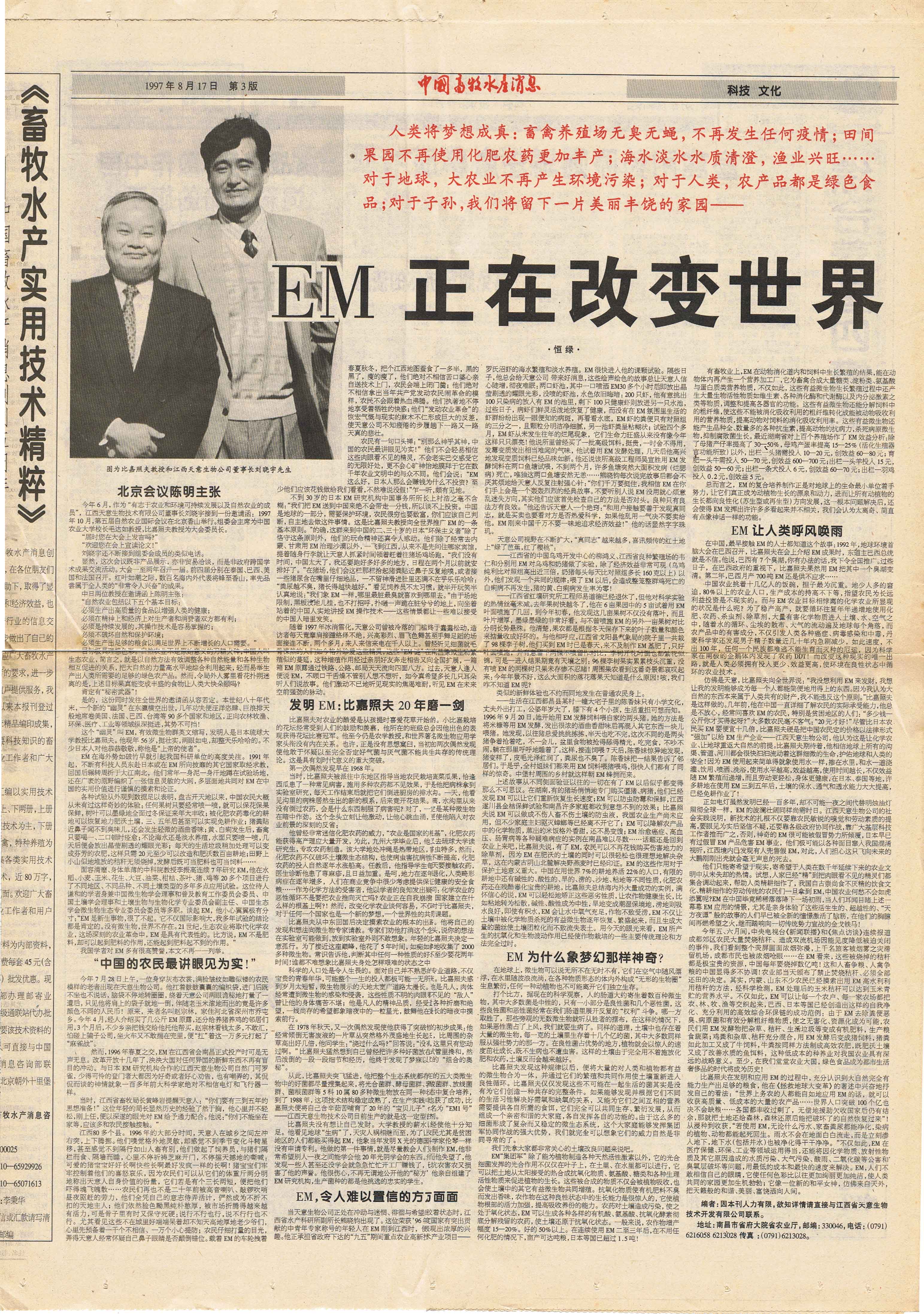 1997年,継《中國畜牧水產(chǎn)報(bào)》、《科技日報(bào)》、《經(jīng)濟(jì)參考報(bào)》、《江西日報(bào)》等媒體發(fā)表長篇通訊《EM原露正在改變世界》,各省科技、農(nóng)業(yè)報(bào)刋均紛紛轉(zhuǎn)載,EM原露在江西最初的使用效果迅速在全國范圍內(nèi)興起了一股熱潮,兩年內(nèi)共簽定縣級代理合同500余家。